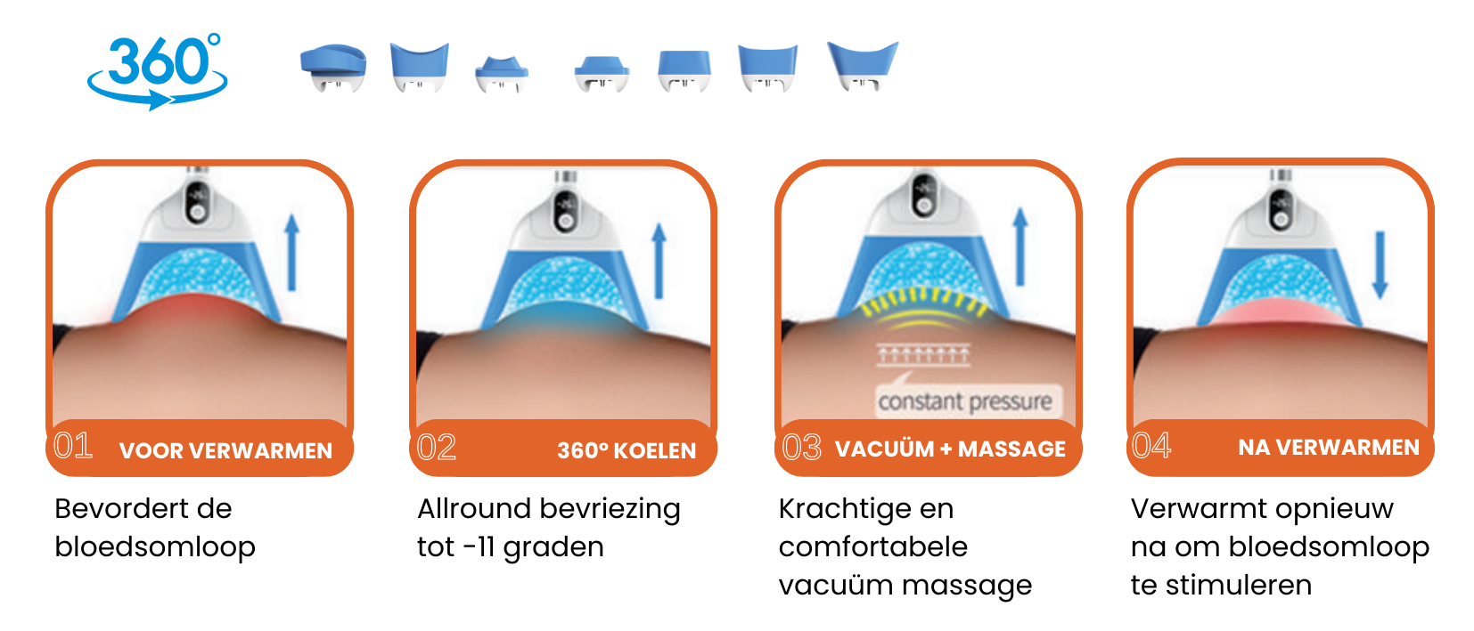 De unieke nieuwe 360° handstukken bieden een metalen cup die volledig (360° rondom) koud wordt. Dit zorgt voor een beter resultaat.