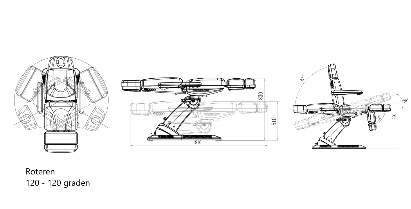 - Elektrische hoog/laag verstelling, Elektrische rug verstelling, Elektrische beendeel verstelling en Elektrische kantelfunctie / trendelenburg,