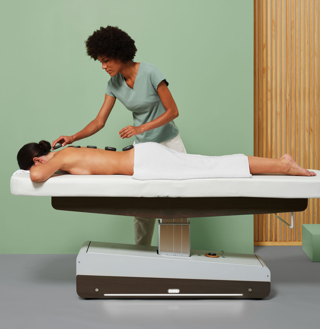 Het is mogelijk om de 'SWOP wellnessbank of behandelstoel uit te rusten met een luxe Bamboo Sound System. Hiermee kun je fijne relax muziek afspelen tijdens het verwennen van jouw clienten. Gebruik de 'SWOP Spotify lijst met lekkere relaxnummers of maak je eigen afspeellijst aan!